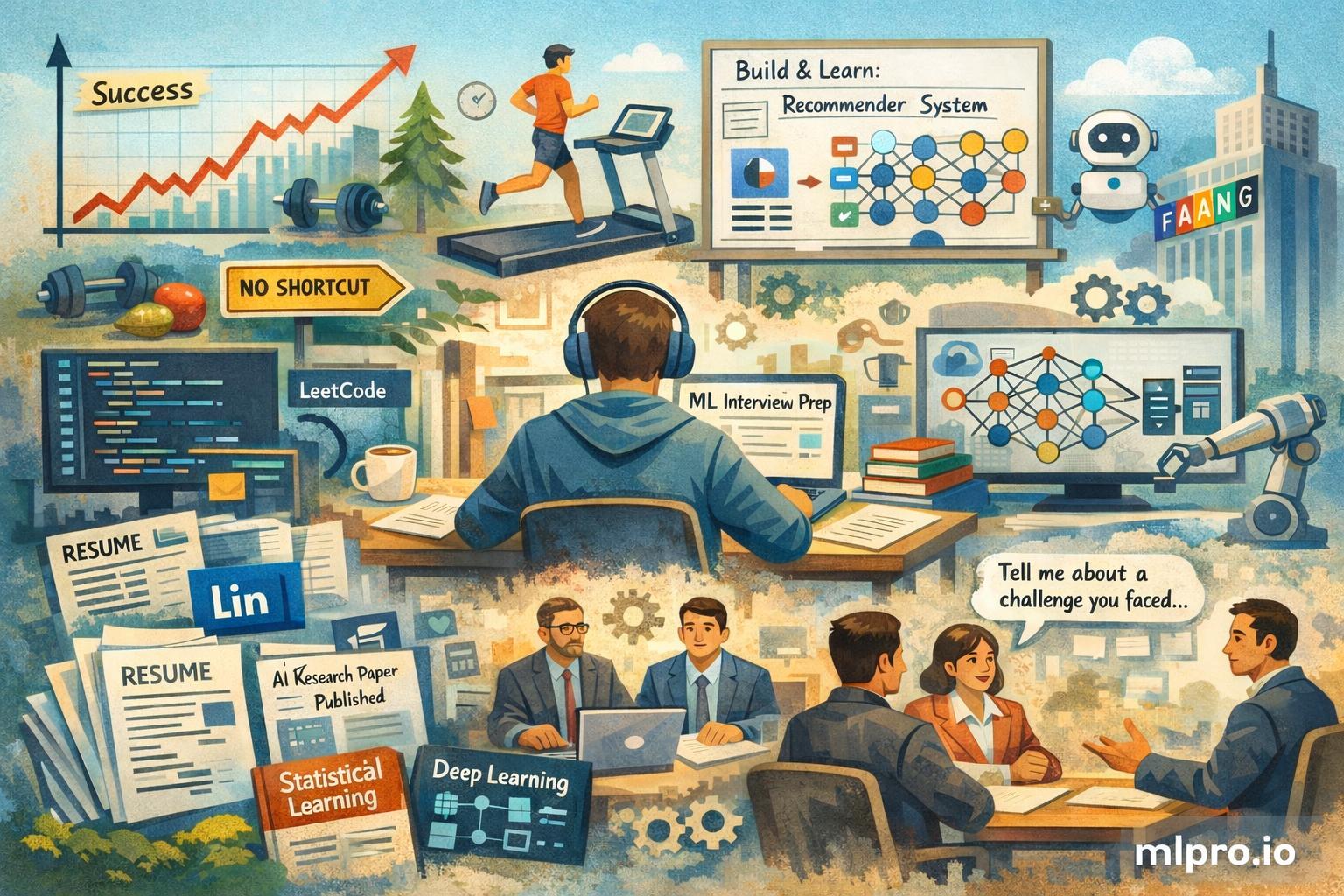 Thankfully, ML interviews don’t have as many LeetCode interviews as regular SWE interviews. I would focus on being very good at Blind 75 questions and then solve company-tagged problems on sites like LeetCode. In 2025, I prepared by going through Blind 75 again and completing ~20 company-tagged questions. This was enough for me to clear several FANG companies. I personally do not recommend you spend so much of your effort in trying to be top 1% of LeetCode. These days, many new grads grind LeetCode during college years and become so good at them. They are probably way better than me. However, I suggest spending more time building actual products and services. Once interview styles change (as companies are) from LeetCode, you will be in trouble. In all of my interviews, I didn’t fly through the interviews. I struggled but was able to communicate my thoughts and solve through them. This is the state you want to get to.